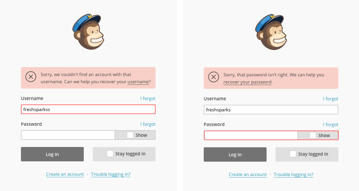 Ошибка авторизации в Мейлчимпе. Сайт точно указывает, в чем проблема — в несуществующем юзернейме или неправильном пароле. Но помимо этого, он сразу же предлагает пользователю следующее логичное действие и показывает прямо в сообщении ссылку на восстановление юзернейма или пароля.